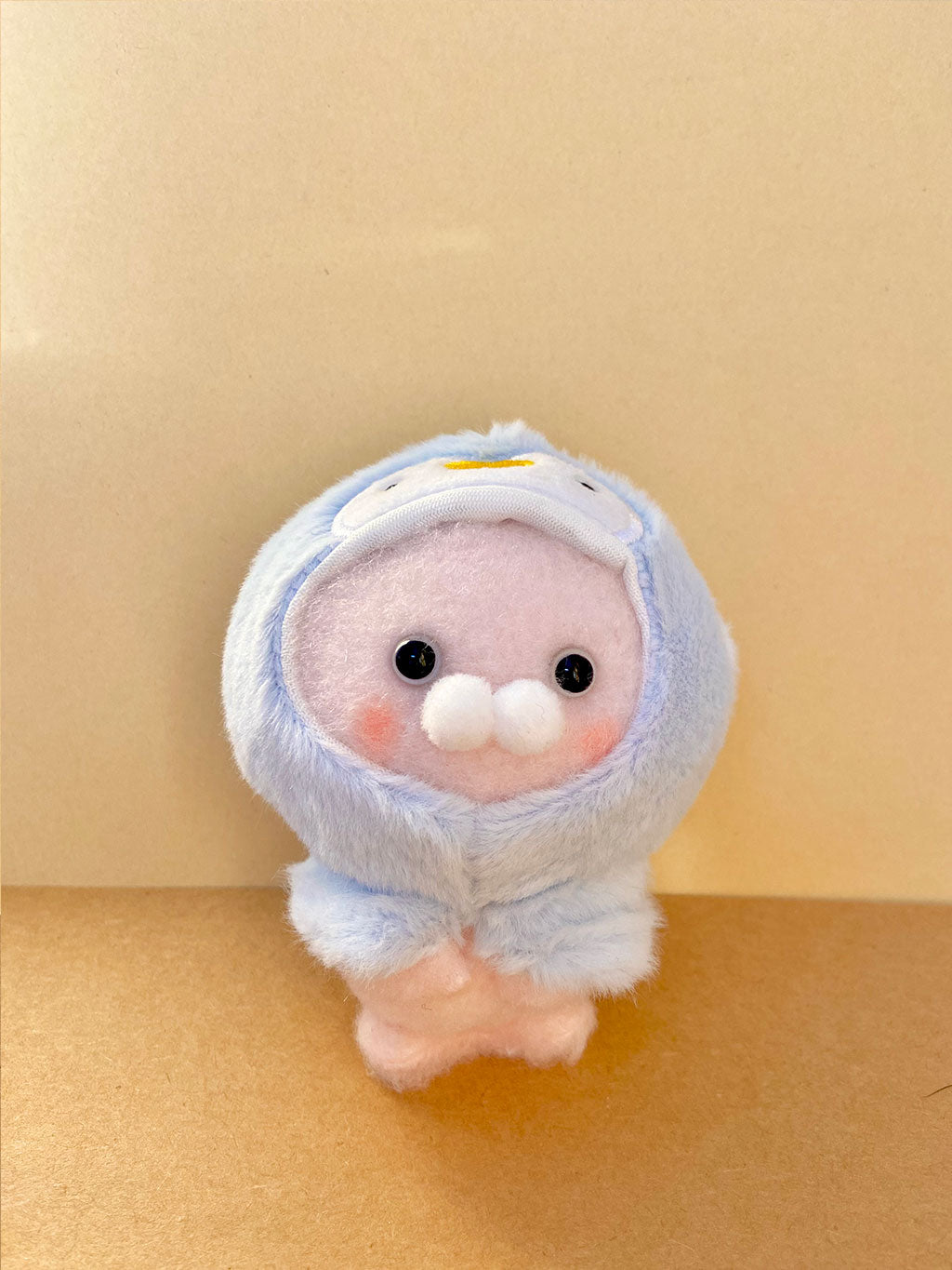 This plush keychain & bag charm features an adorable pink seal wearing a blue cape with a penguin design. It's cute and fun, perfect for adding a lovely and whimsical touch to your keys or bag.